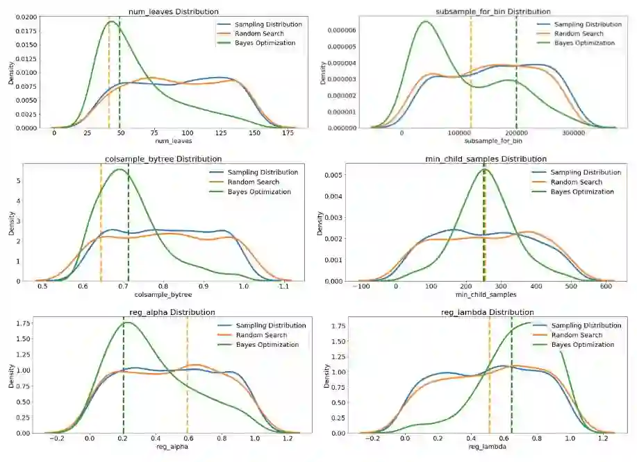 既然我们已经有了这些结果,我们可以看看所有参考分布、随机搜索、以及贝叶斯优化中数值化的超参数。垂直的虚线表示每次搜索是超参数的最优值: