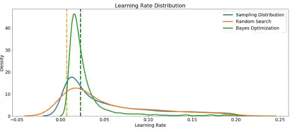 我们将学习率定义为 0.005 到 0.2 之间的对数正态分布形式,贝叶斯优化的结果与采样分布的结果看起来相类似。这说明,我们定义的分布看上去很适合这个任务,尽管最优值比我们放置最大概率的位置略高。这个结果可以用于通知域空间进一步搜索。