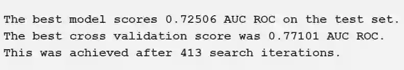 作为参考,500 轮随机搜索返回一个在测试集上 ROC AUC 得分为 0.7232、在交叉验证中得分为 0.76850 的模型。一个没有经过优化的缺省模型在测试集上的 ROC AUC 得分则为 0.7143.