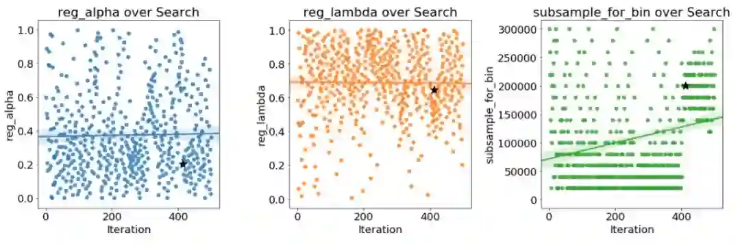 黑色的星星代表最优值。「colsample_bytree」和「learning_rate」随着时间的推移而下降,这可以在未来的搜索中为我们提供指导。