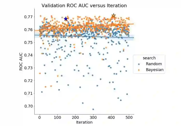 随着时间的推移,贝叶斯超参数优化的验证得分会越来越高,这说明该方法正在尝试「更好」的超参数值(值得注意的是,只是根据验证分数说明这些值是更好的)。随机搜索并不会随着迭代次数增加显示出性能提升。