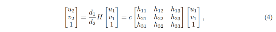这里的c=d1/d2是可以从等式最后一行解出来的,也即 c = 1/(h31u1 + h32v1 + h33)。然后可以得到: