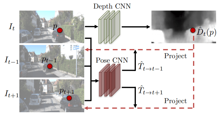 2.根据 [1],SfMLearner [2] (CVPR 2017) 提出在已知相机内参的单目视频上训练单目深度估计网络。原理是在视频前后帧上除了训练depth CNN外,再额外引入一个Pose CNN来估计相机外参(也就是相机运动),然后在训练过程中使用photometric loss来同时监督这两个网络。框架如下: