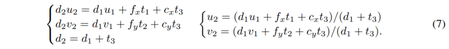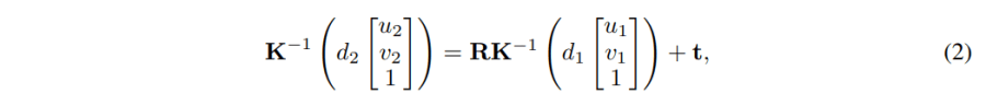 这里,K是一个3×3的相机参数矩阵,R是3×3的旋转旋转,t是3×1的平移向量,d1, d2分别代表这个点在两张图像上的深度。也就是说当我们知道(u1,v2, d1), K, R, t,就可以计算出(u2, v2, d2)。这说明了在完整投影过程中,图像深度与相机运动共同影响了投影结果。