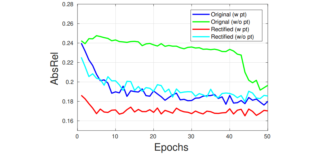 3.SC-SfMLearner在NYUv2上的训练曲线如下图所示,基中 “pt”指 ImageNet上的预训练。