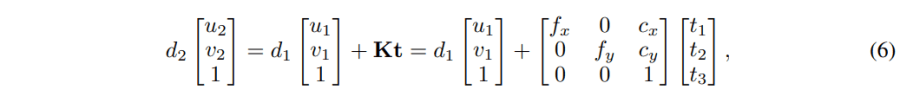 也就是说,在从(u1,v2) 到 (u2,v2) 的投影中,d1是与t相关联的。必须知道d1,才能完成投影。正是这种关系使得深度与投影有了联系,从而可以利用这种联系来训练深度估计网络。所以得到结论,平移是信号。