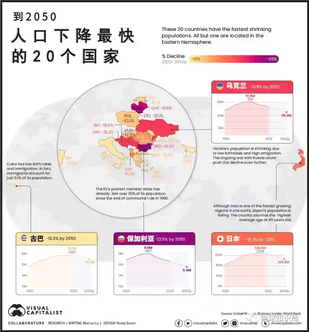 与此同时,一些欧洲国家人口会大幅减少。比如保加利亚、拉脱维亚、立陶宛、塞尔维亚和乌克兰,预计到2050年人口规模比现在相对减少20%甚至更多。