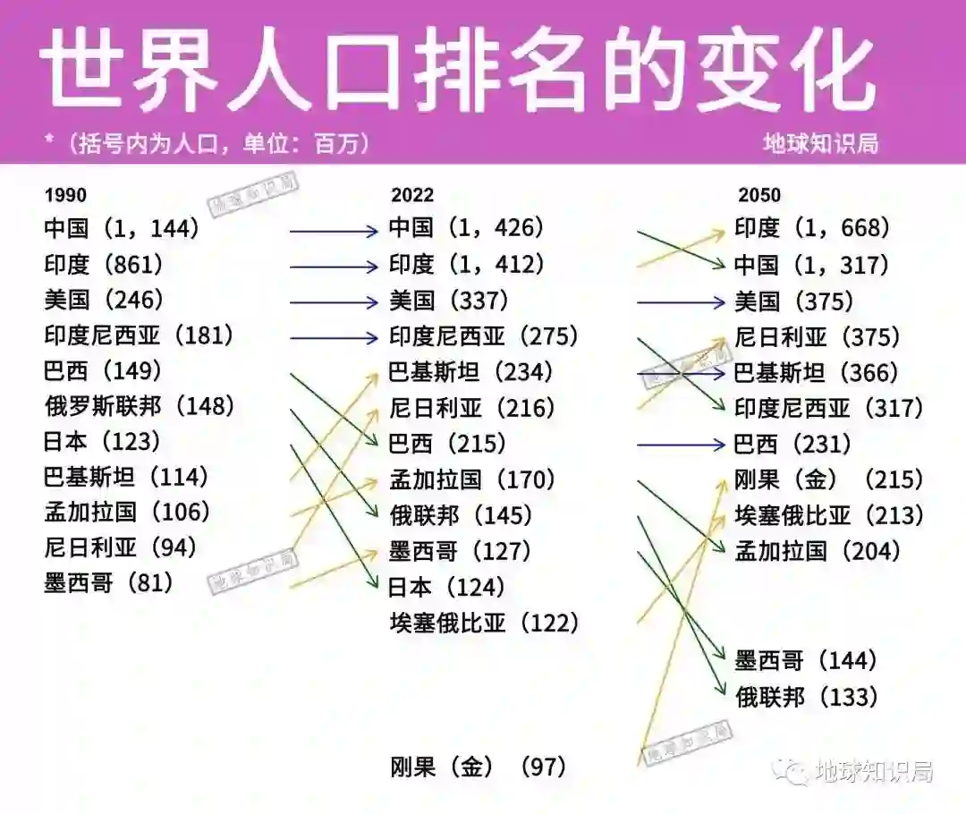 但如果把全世界人口数量前十位的国家列出来,就会发现,到2050年世界人口分布将大不一样。