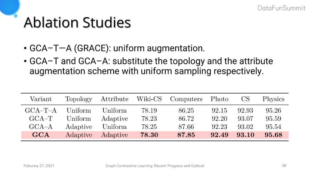 实验结果表明GRACE和GCA的分类效果明显优于其他模型。在消融实验中,我们分别对于拓扑结构以及节点属性的数据增强对比了uniform augmentation与adaptive augmentation的效果,结果表明adaptive augmentation对评价指标有大约半个点至一个点的提升。
