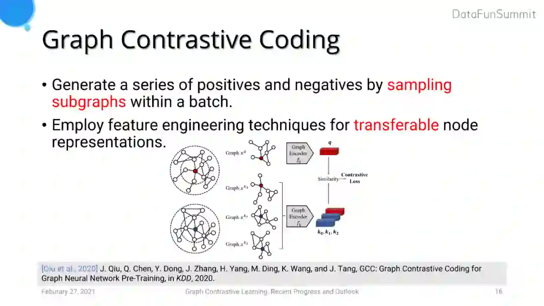 Graph Contrastive Coding (GCC) 考虑将对比学习方法引入图的预训练任务中,即训练数据与测试数据来自于不同的domain。GCC采用的正样本对是图中同一个anchor节点生成的子图,而负样本对则是图中不同anchor节点生成的一对子图。GCC由于考虑到了模型迁移性的问题,使用了特征工程的方法手工生成了一些节点特征。