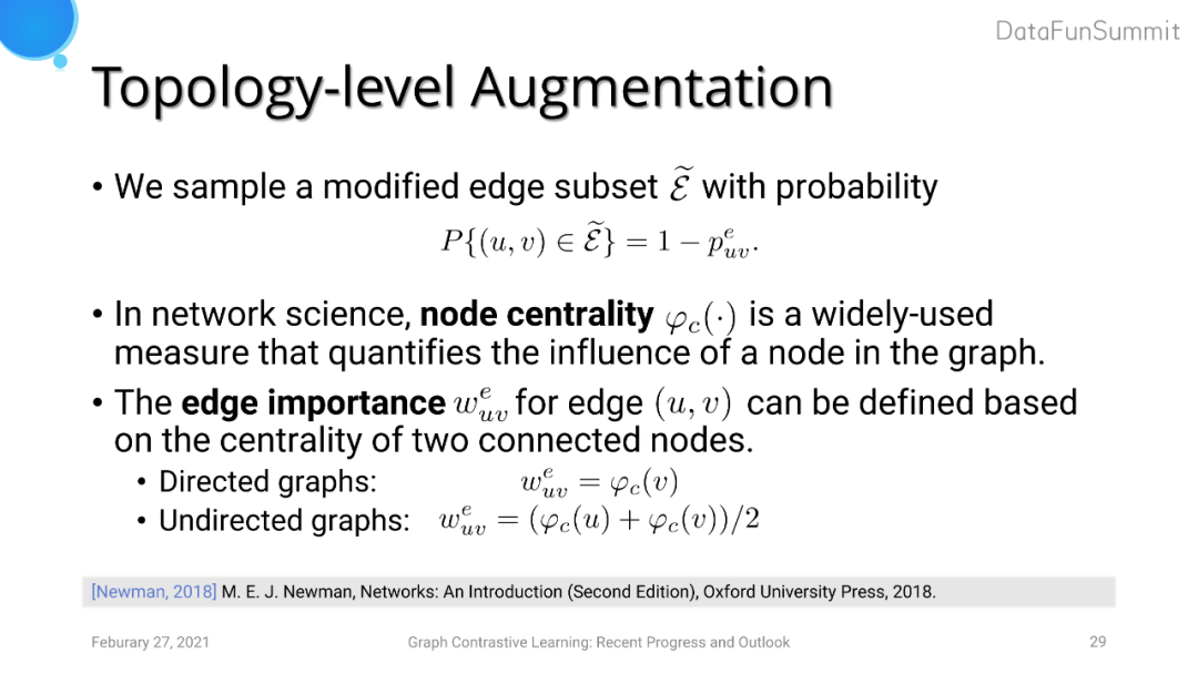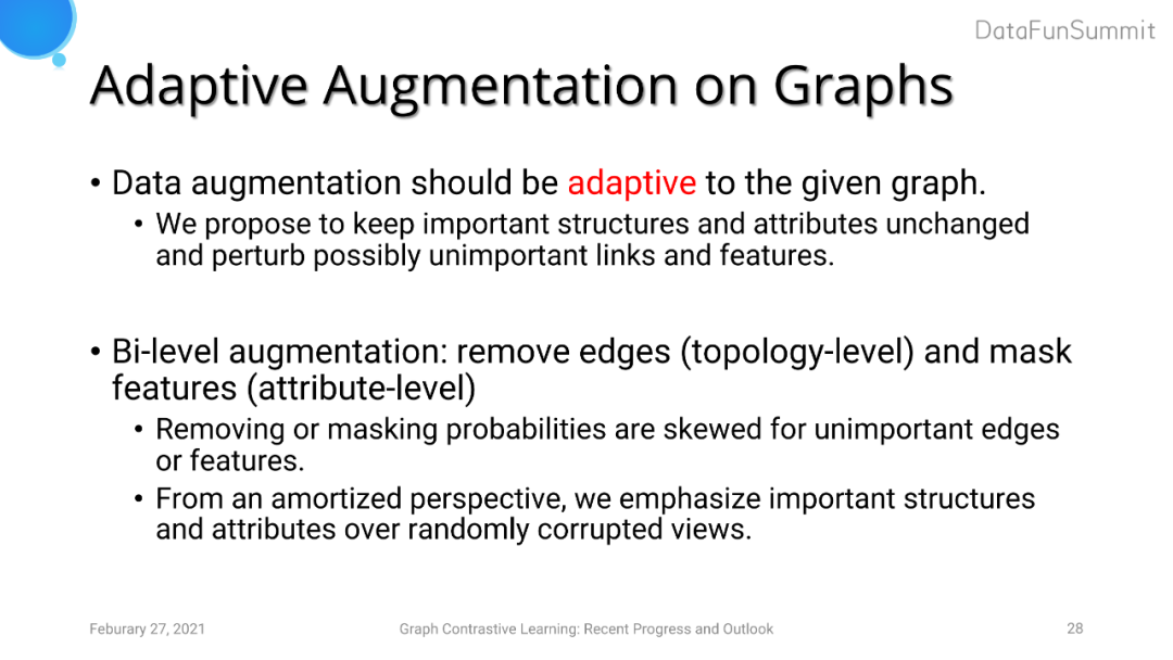 本质上来说,对比学习希望模型能学习到在外界施加扰动的情况下不敏感的特征表达。但是在图中每个节点和每一条边的重要程度不同,我们在data augmentation时进行去边的操作时应该尽可能多的去除不重要的边,进而可以保留图中重要的边与节点的结构信息以及属性信息。