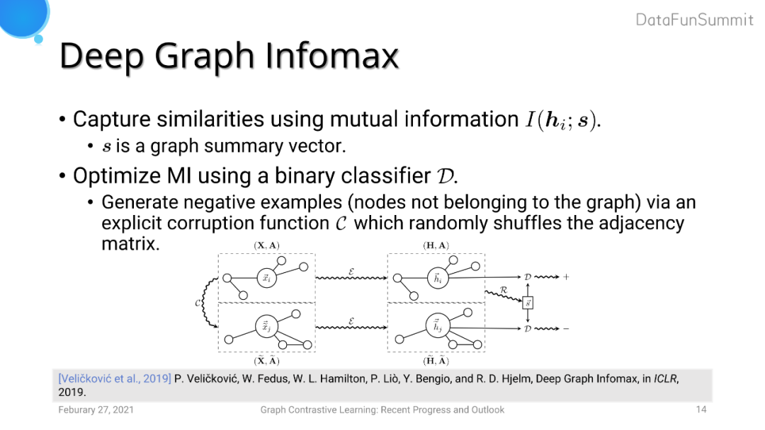 Deep Graph Infomax (DGI) 旨在使得模型生成的节点级别的表达以及图级别的表达在embedding空间的距离拉近。DGI使用MLP将节点特征和图特征做一个二分类任务,用来判断这两类特征是否来自于同一个图。它们生成负样本的策略是将图邻接矩阵进行random shuffle的操作。