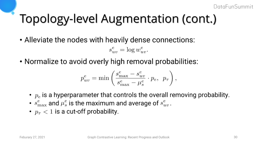拓扑结构层面的数据增强主要基于node centrality的指标,其用来衡量一个节点在图中的重要性。边的重要性可以使用两个节点的centrality来综合得到。考虑到图中可能存在长尾分布(即存在heavily dense connections的节点),我们对边重要性进行取log的操作进行缩放。此外,我们还对计算出的removal probabilities进行了标准化操作来避免出现过大的概率值。