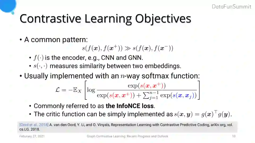 对比学习目标函数类似metric learning中triplet loss的形式。在metric learning中我们希望一对正样本的embedding之间的距离拉近,而一对负样本的embedding之间的距离尽可能远。类似地,对比学习中常常采用的损失函数是InfoNCE loss,其可以看做是一个n分类问题。与triplet loss的目标对应,我们希望从一个正样本对和n-1个负样本对中间使得正样本对之间的embedding距离拉得更近。