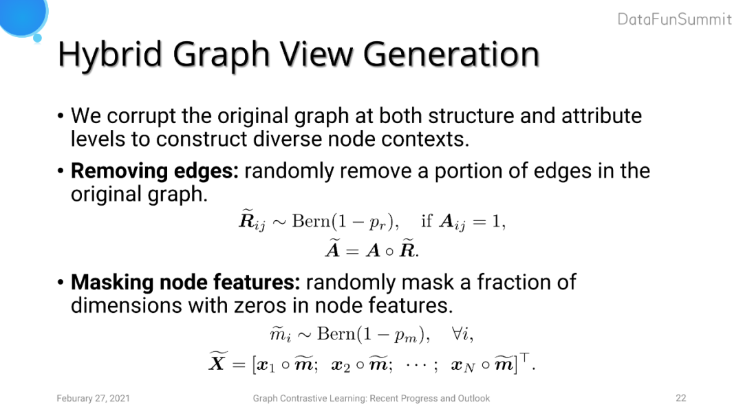 针对图数据增强这一方面,GRACE采用了两种策略,分别对应于结构层面以及属性层面的数据扰动。首先,我们采取了随机删边的方法。这里不采用加边的原因是为了使模型计算复杂度尽量小。另外一方面,我们对图的节点特征进行了随机扰动。具体地,我们对节点特征的每一个维度进行随机的mask。