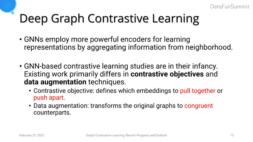 目前大家更倾向于探索深度图对比学习的方法。GNN通过对邻居节点的信息进行聚合来学习节点的特征表达,所以它可以看作是一个更加强大的encoder。但是图对比学习尚处于发展的早期阶段,目前的工作主要在两方面进行探索创新:对比学习的目标以及数据增强。前者的设计关键点是定义将什么样的embedding在特征空间中的距离拉近或者拉远,而后者的难点在于设计图数据增强的策略(相较于CV的数据增强技术,图数据不同domain下蕴含的先验信息差异巨大)。