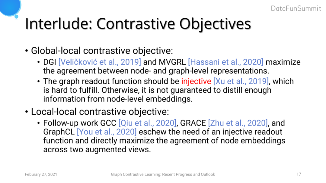 对于Contrastive Objectives的探索,DGI和MVGRL采用的是global-local的思想,即采用图节点的特征表示与图全局表示进行对比学习。但是这一做法要求生成图全局特征时聚合函数是个单射函数,否则模型无法保证充分利用图节点的embedding信息。而GCC以及我们提出的GRACE和同期GraphCL的工作采用了local-local的思路,即直接利用两个经过增强的view中节点的embedding特征,巧妙地绕开了设计一个单射读出函数的需求。