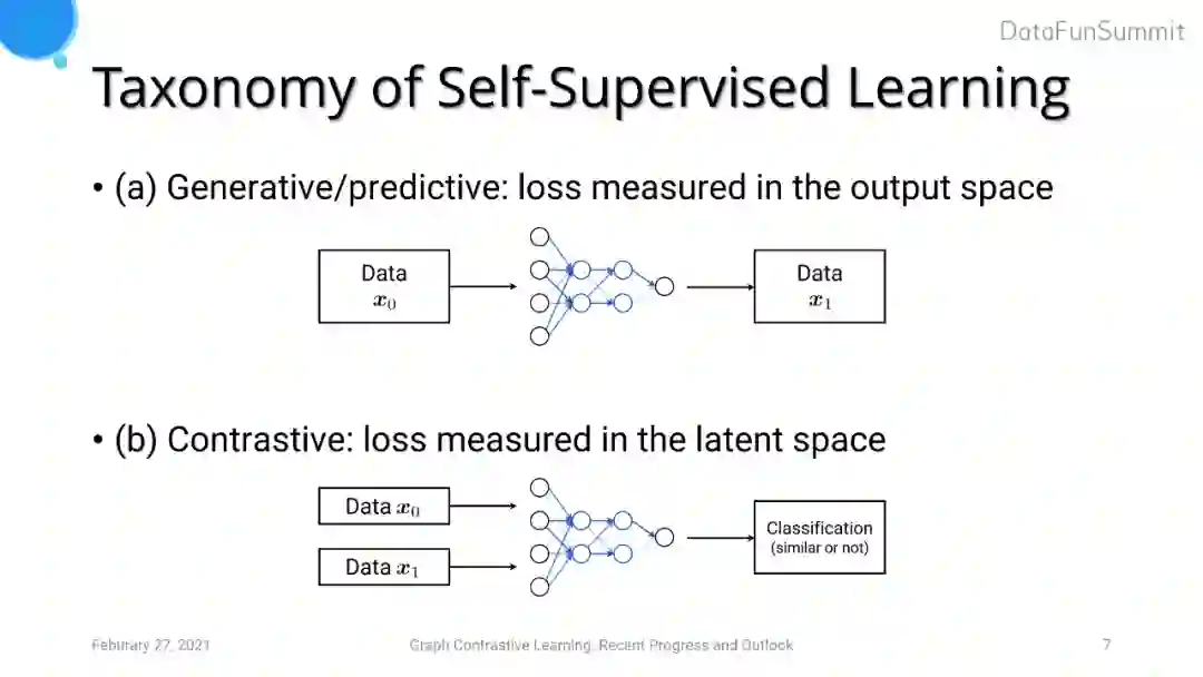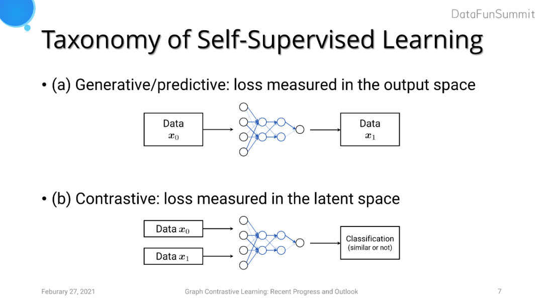我们可以进一步将代理任务分为两类。第一大类的方法是Generative/predictive的任务,其损失是在输出空间进行度量,代表模型为Autoencoder(重建损失)以及对图像的重建等。另一大类是最近比较热门的Contrastive(对比学习)的任务,旨在引导模型去学习输入的一对数据的相关信息(是否来自于同一个数据源、是否是相似数据等)。对比学习相较于第一类任务的优点在于模型不需要学习细粒度级别的特征(如pixel-level features),而是更多关注在高层次抽象级别的特征中,因为这些特征足以区分不同物体与数据。
