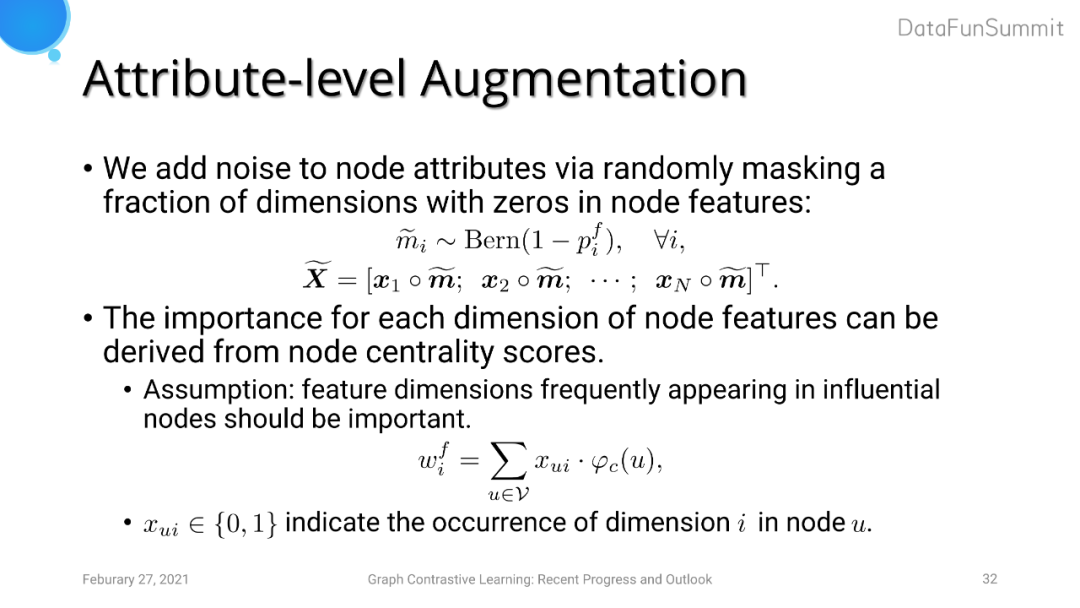 针对图对比学习中的数据增强,现有大多数模型仅仅采用了图结构信息的增强,例如打乱邻接矩阵、添加/删除边、图采样、使用diffusion kernel生成新的全局view等。我们的工作还考虑了节点attribute level的数据增强,包括随机扰动节点部分维度的特征、添加高斯分布的噪声等。
