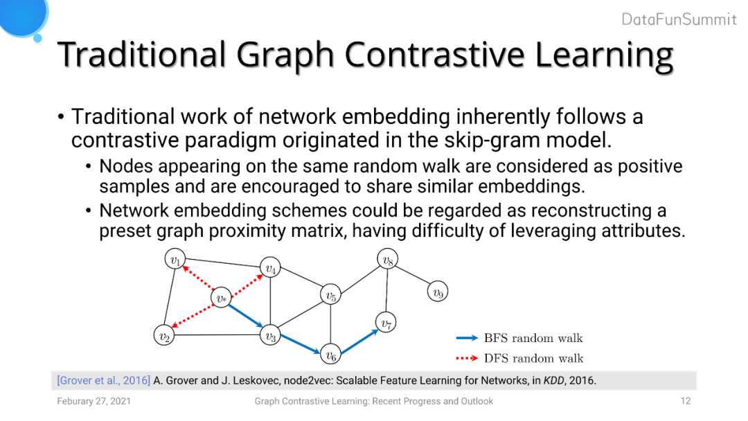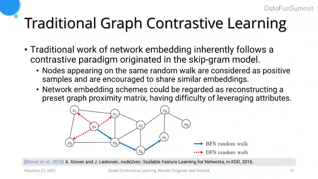 图对比学习的诞生时间实际上早于CV中的对比学习。之前network embedding的工作本质上运用到了对比学习的思想。例如node2vec中使用BFS或者DFS的随机游走,希望出现在同一walk序列中的节点具有相似的embedding,而不在同一walk上的节点embedding距离拉远。但是network embedding的方法中的encoder特征提取能力较弱,只是做了embedding lookup的操作,而不像DNN有着强大的特征表达能力。此外,已经有工作证明了network embedding的方法实际上是对图proximity矩阵的重建,这意味着这一方法仅仅利用到了图的结构信息,而并没有利用节点attribute信息。