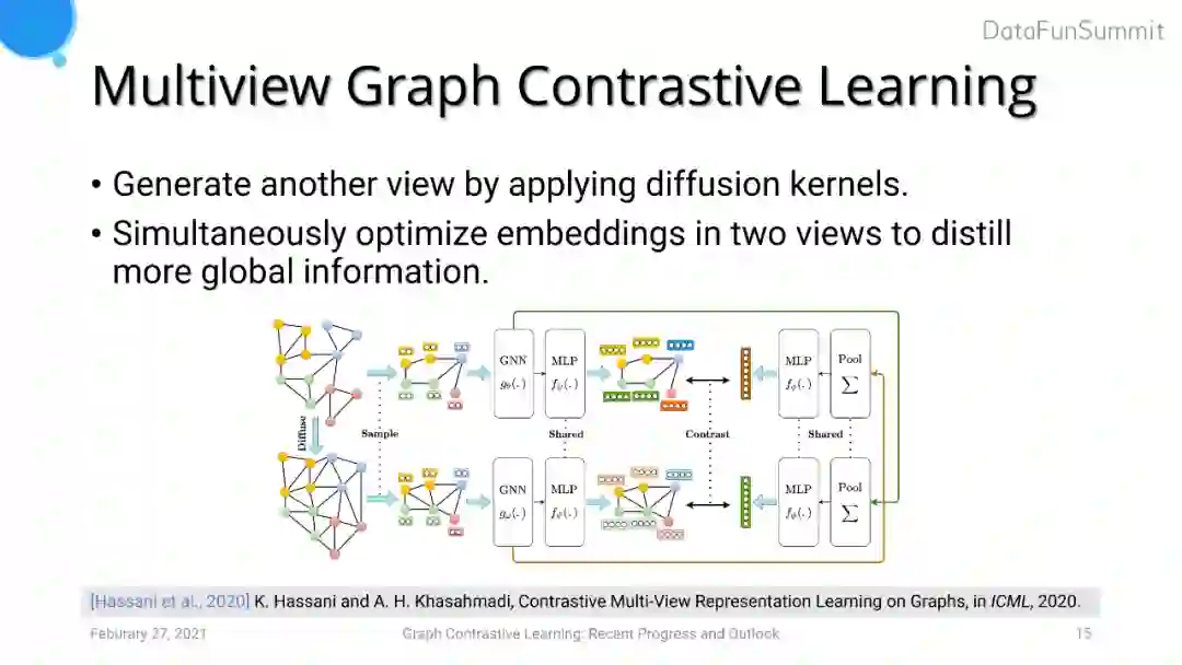 Multiview Graph Contrastive Learning (MVGCL) 采用diffusion kernel来生成一张图的另一个view。Diffusion kernel可以使每个节点感知到更多全局信息,相当于对图结构进行数据增强。在此基础上,MVGCL会对两个view进行采样得到两个子图。之后使用类似于DGI的方法,对两个子图两两之间做对比学习,即选取一个子图提取其节点embedding,对另一个子图生成全局图的embedding进行对比学习。通过这种方法,节点的表达可以吸收到更多图级别的信息,同时图级别的任务可以更好地利用到节点级别的表达。但是MVGCL的缺点是经过diffusion kernel后新生成的view是一个dense graph,使用深度图学习模型的计算复杂度较高。