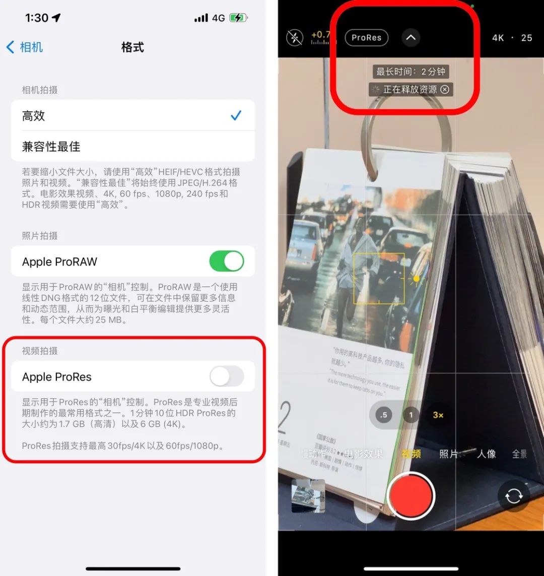 Apple ProRes 支持最高 4K 30帧、1080P 60 帧,要求设备具有 256GB1 存储空间。在设置中,Apple 提示Apple ProRes 格式会占用大量空间,一个 1 分钟 10 位 HDR 视频占用大约 1.7GB,4K 占用 6GB。在拍摄时,iPhone 会根据剩余空间实时计算可支持的视频时长。