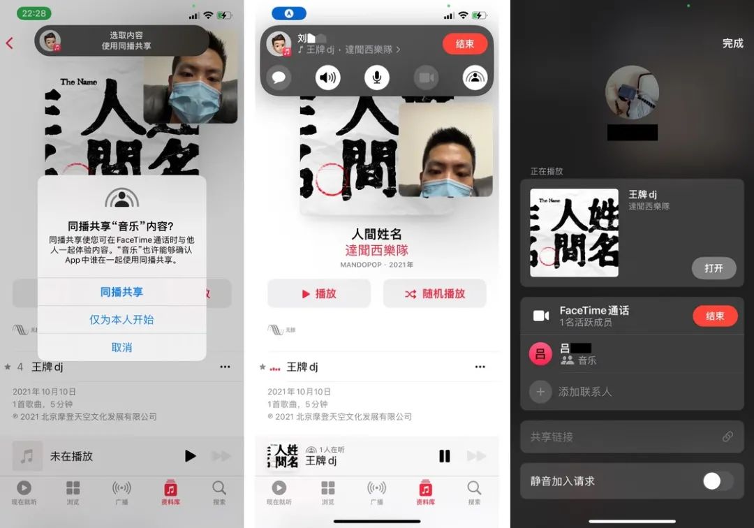 当我们在 FaceTime 通话时,打开 Apple Music,系统便会提示启用同播共享音乐内容。启动后我们还能知道是谁在共同聆听。要想顺利实现同步聆听音乐,还要求通话双方都是 Apple Music 订阅用户。在同播共享时,双方还能同步控制播放,暂停、快退、快进等。