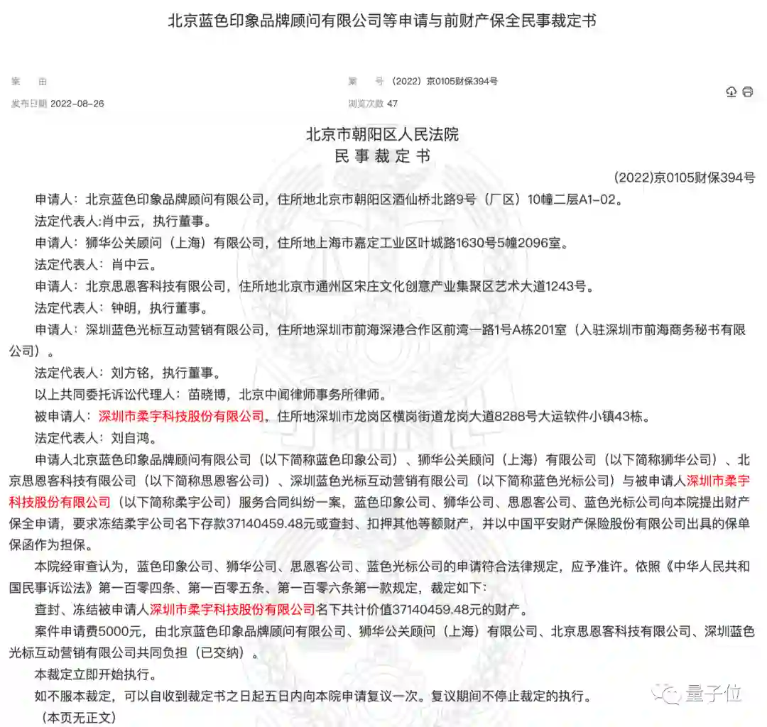 虽然案件具体细节尚未公布,但根据裁判文书网该案申请人为4家知名公关公司和广告公司,属于服务合同纠纷,已立即开始执行。