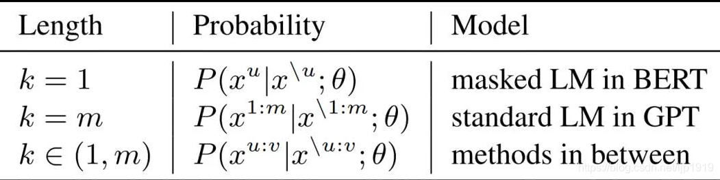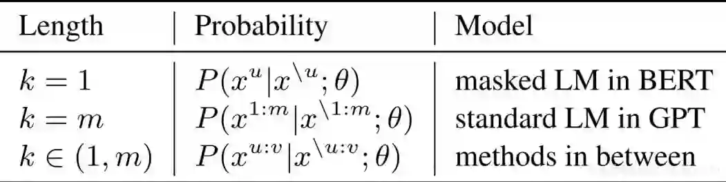 MASS 在不同 K 下的概率形式如下表所示,其中 m 为序列长度,u 和 v 为屏蔽序列的开始和结束位置,x^u:v 表示从位置 u 到 v 的序列片段,x^\u:v 表示该序列从位置 u 到 v 被屏蔽掉。可以看到,当K=1 或者 m 时,MASS 的概率形式分别和 BERT 中的屏蔽语言模型以及 GPT 中的标准语言模型一致。