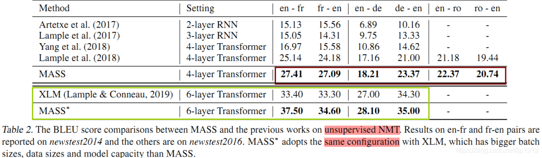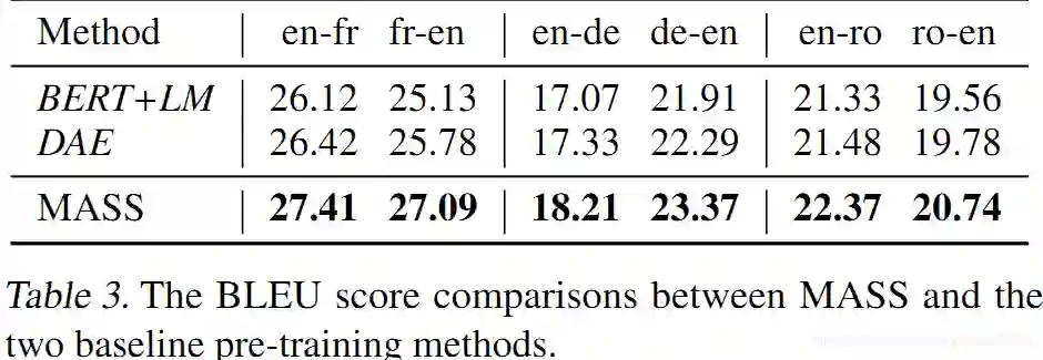 从table 3可以看出,DAE的BLEU得分比BERT+LM更高,而MASS在所有的数据上都一枝独秀。DAE采用了一些降噪方法,如随机遮蔽tokens或者互换相邻的tokens,其decoder能够很容易通过encoder-decoder attention学习到未遮蔽的tokens含义。另一方面,DAE的decoder端能够充分利用输入的所有句子,这使得下一个token的预测(类似语言模型)变得容易许多。这也就无需强制decoder从encoder端学习到更多有用的表征。