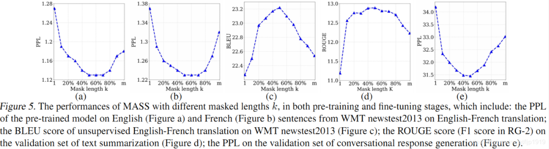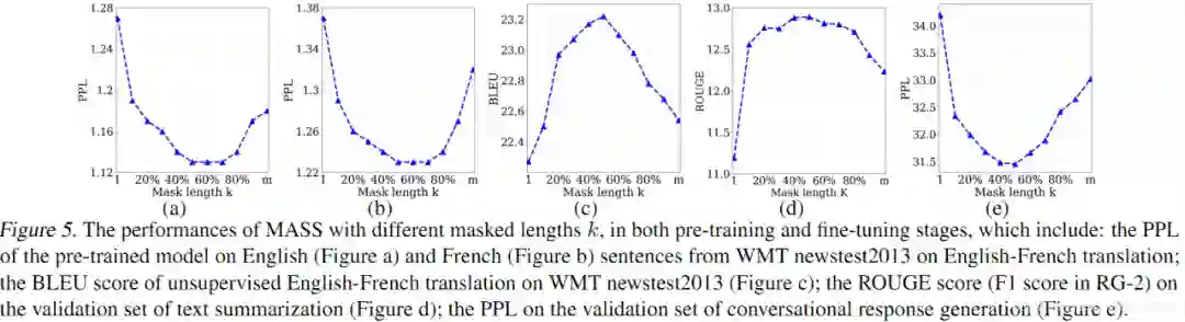 我们通过实验分析了屏蔽 MASS 模型中不同的片段长度(k)进行预训练的效果,如下图所示。