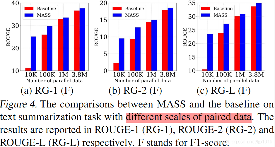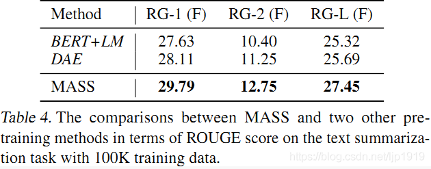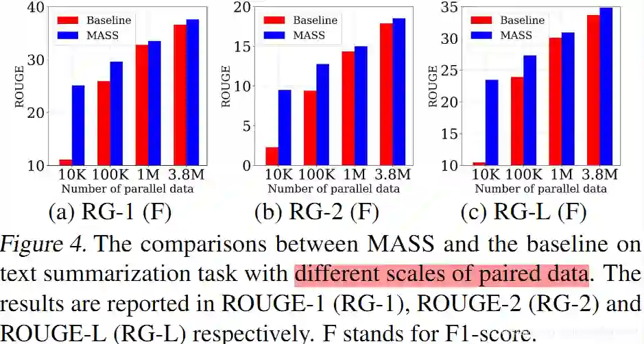 在文本摘要生成(Gigaword Corpus)任务上,我们将 MASS 同 BERT+LM(编码器用 BERT 预训练,解码器用标准语言模型 LM 预训练)以及 DAE(去噪自编码器)进行了比较。从下表可以看到,MASS 的效果明显优于 BERT+LM 以及 DAE。
