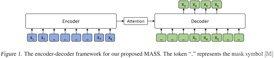 MASS在自然语言生成任务上联合了预训练的encoder和decoder。首先,通过seq2seq框架仅仅预测被屏蔽掉的tokens。MASS强制要求encoder理解透彻未被屏蔽的tokens含义,同时激励decoder从encoder这里抽取有意义的信息。其次,通过预测连续的tokens而非离散的tokens,decoder端能够构建更好的语言建模能力。第三,在decoder端对于在encoder端未被屏蔽的input tokens进行屏蔽(即,在decoder的inputs上放弃先验信息)。例如,当想要预测,