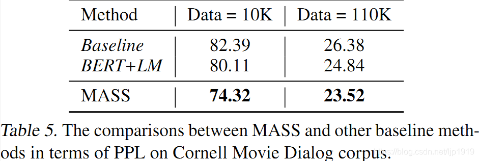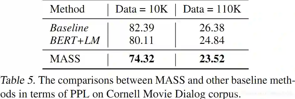 在对话生成(Cornell Movie Dialog Corpus)任务上,我们将 MASS 同 BERT+LM 进行了比较,结果如下表所示。MASS 的 PPL 低于 BERT+LM。