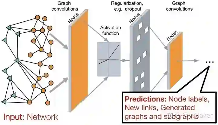 因此一个比较常见的图神经网络的应用模式如下图(图4),输入是一个图,经过多层图卷积等各种操作以及激活函数,最终得到各个节点的表示,以便于进行节点分类、链接预测、图与子图的生成等等任务。