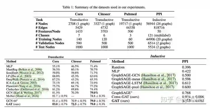 那么GAT的具体效果如何呢?作者分别在三个Transductive Learning和一个Inductive Learning任务上进行实验,实验结果如下: