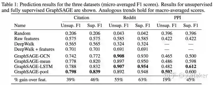 那么GrpahSAGE的实际实验效果如何呢?作者在Citation、Reddit、PPI数据集上分别给出了无监督和完全有监督的结果,相比于传统方法提升还是很明显。