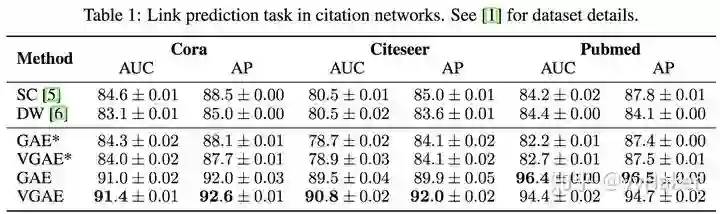 那么两种图自编码器的效果如何呢?作者分别在Cora、Citeseer、Pubmed数据集上做Link prediction任务,实验结果如下表,图自编码器(GAE)和变分图自编码器(VGAE)效果普遍优于传统方法,而且变分图自编码器的效果更好;当然,Pumed上GAE得到了最佳结果。可能是因为Pumed网络较大,在VGAE比GAE模型复杂,所以更难调参。