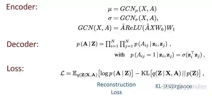 编码器(Encoder)采用简单的两层GCN网络,解码器(Encoder)计算两点之间存在边的概率来重构图,损失函数包括生成图和原始图之间的距离度量,以及节点表示向量分布和正态分布的KL-散度两部分。具体公式如图12所示: