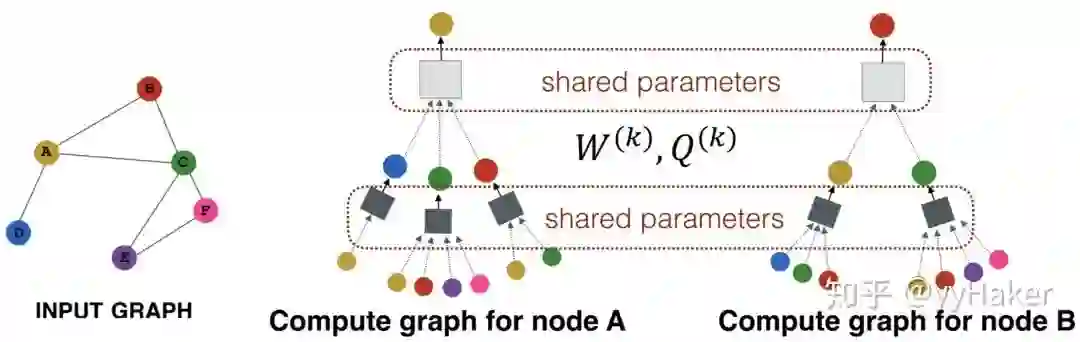 为了看的更清晰,我们将更新某个节点的过程展开来看,如图8分别为更新节点A和更新节点B的过程,可以看到更新不同的节点过程每一层网络中聚合器和权重矩阵都是共享的。