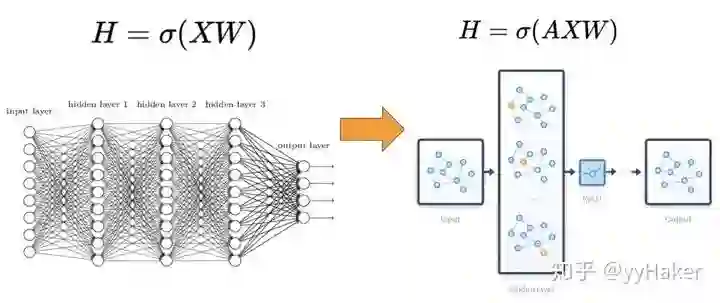 相比较于神经网络最基本的网络结构全连接层(MLP),特征矩阵乘以权重矩阵,图神经网络多了一个邻接矩阵。计算形式很简单,三个矩阵相乘再加上一个非线性变换(图3)。