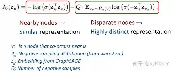 无监督的情况下,可以假设相邻的节点的embedding表示尽可能相近,因此可以设计出如下的损失函数,