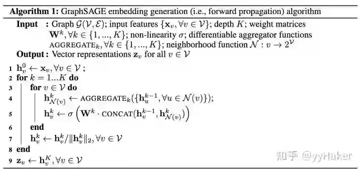 后,(line4)利用聚合函数聚合邻居节点的信息,(line5)并结合自身embedding通过一个非线性变换更新自身的embedding表示。