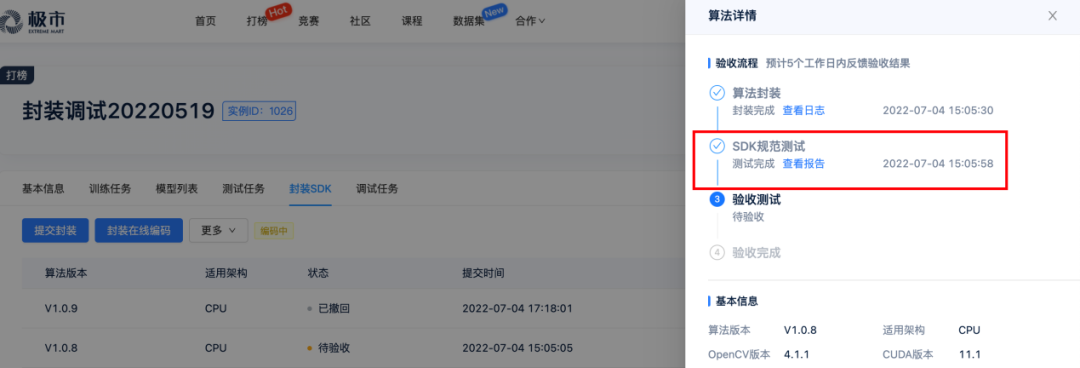 而SDK封装有严格的规范要求,如果人工手动校验比较耗时,也容易遗漏细节。为此,极市平台推出了自动化SDK规范测试功能,校验内容包括工程路径是否存在、库文件是否正常加载、输入输出图片的尺寸是否一致、内存是否被释放等。整个校验过程平均只需60 秒以内!