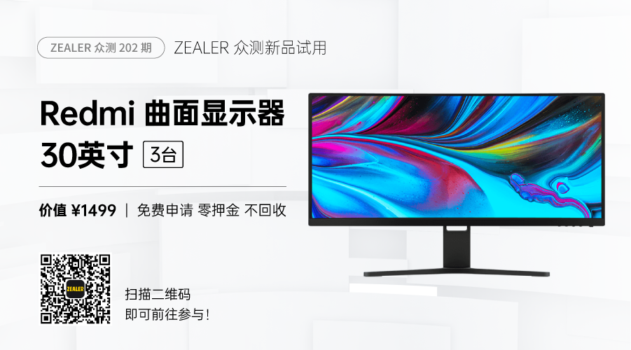 身为硬核玩家,需要一台怎样的显示器?Redmi 曲面显示器 30 英寸已上线 ZEALER 众测!21:9 超宽屏巨幕,一眼掌控全局。200Hz 电竞级高刷,观感如丝般顺滑。还有 126% sRGB 广色域覆盖,尽享缤纷色彩表现。扫上方二维码或戳左下角「阅读原文」即可申请免费试用。