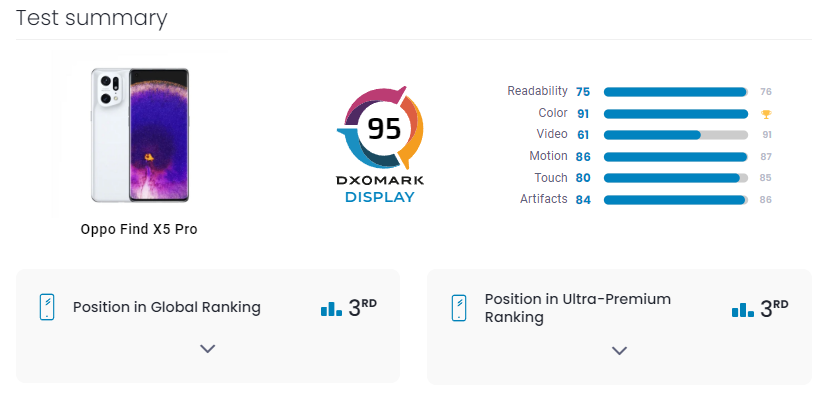 DxOMark 表示,OPPO Find X5 的屏幕有着出色的易读性,无论是在室内和还是弱光场景中,都具有良好的亮度,能够很好地适应环境光线的转变。在大多数情况下,屏幕触控非常流畅且准确。此外,这款设备的色彩和亮度均匀度也很不错。总体而言,OPPO Find X5 在大多数使用场景中都能为用户带来良好的阅读体验,整体表现优于前代产品 OPPO Find X3 Neo。