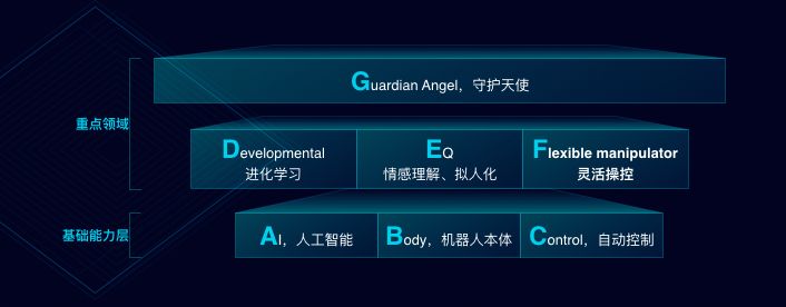 机器人由自动走向自主、人机共生成为大势的“智能机器人”时代,公司应该着力于哪些突破点?张博士提出A-G7大技术突破点理论:首先是攻克ABC基础能力——人工智能(AI)、机器人本体(Body)与自动控制(Control)能力;其次要继续探索代表机器人智能趋势的D到G能力——进化学习(Developmental Learning)、情感理解与拟人(EQ)、灵活操控(Flexible Manipulation);最后,实现成为人类守护天使(Guardian Angel)的终极目标。