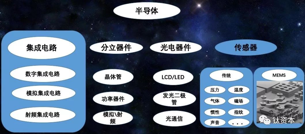 半导体,是元素周期表的某些元素,如硅、锗、碳等等,在一定条件下有导电或绝缘的特性。半导体大致可以分成几个大类:第一类是传感器,包括传统的传感器和MEMS(微机电系统)传感器,传统的传感器包括压力、温度、气体、磁场、惯性、指纹、声音等传感器,MEMS工艺可以做得更小;第二类是光电器件,包括现在常用节能灯上的发光二极管,以及电子面板如手机或电视面板,包括华为折叠屏手机用面板也属于半导体器件;第三类是分立器件,包括晶体管、功率器件、模拟或射频;第四类是集成电路,包括数字集成电路、模拟集成电路、射频集成电路。