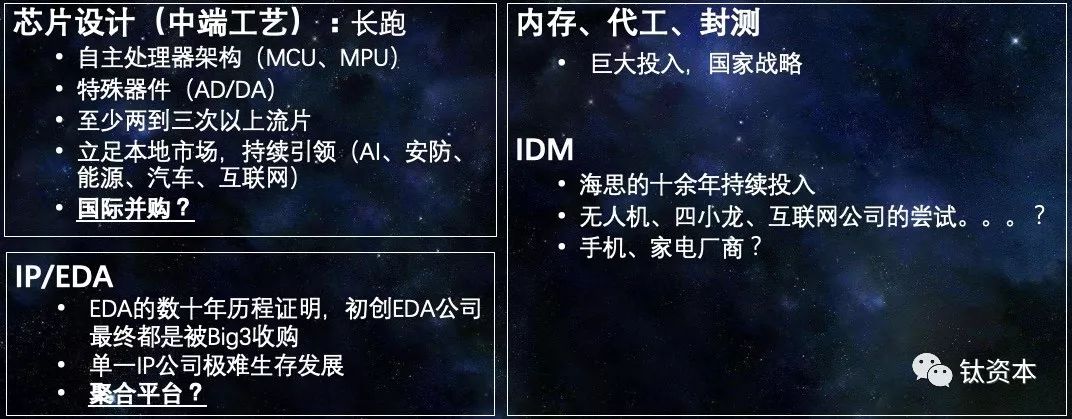 除此之外,类似中国基金全资收购英国IP公司Imagination,也是一条可行的道路。除了美国外,在其它的一些地方,特别是欧洲还有些小而美的公司可以进行国际并购,从财务上面取得控制权,然后再慢慢消化吸收、引进人才等等。