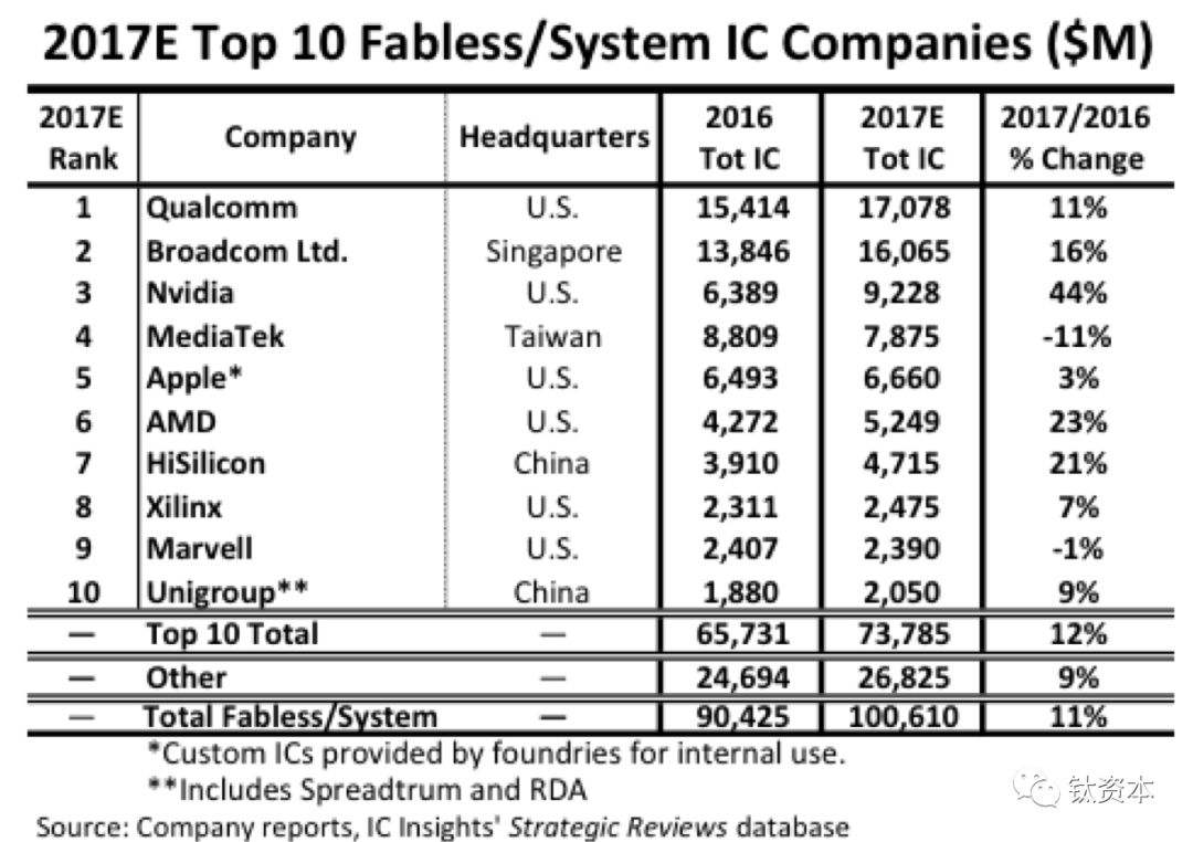 图2是2017年Fabless公司Top10榜单,十家公司中六家来自美国,一家来自新加坡,一家来自台湾地区,两家来自祖国大陆(华为的海思和清华下的嘉瑞集团),而欧洲和日本在榜单上都出局了。再考虑到博通把总部迁移到美国,那就意味着美国占了七家,比例非常惊人。其中比较看好的是海思,海思在2018年的营收将近74亿美金,之前有看法说如果海思的营收在2019年能保持20%的增幅,有可能超过图一中的NXP,不过在现在的形势下这个挑战的难度大大增加了。